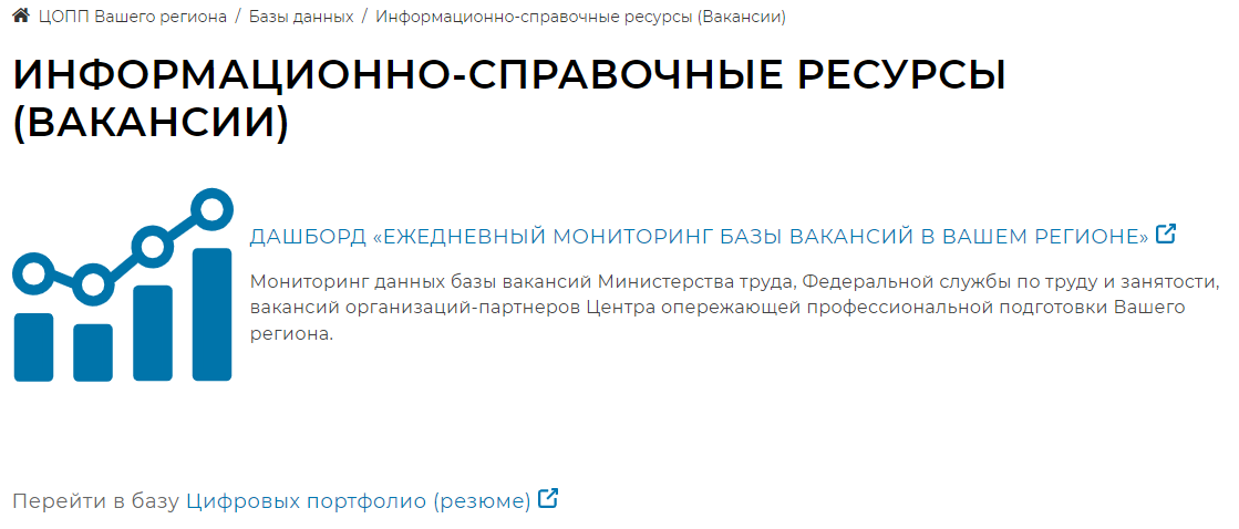 Для подробного просмотра выбранной вакансии необходимо кликнуть по ее названию, откроется новая вкладка на сторонний ресурс или на Карточку вакансии, если она была добавлена при помощи формы на Платформе ЦОПП.