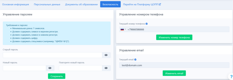 Во вкладке «Безопасность» можно подтвердить email, номер телефона, изменить пароль, а также просмотреть информацию о связанных аккаунтов пользователя (VK, Яндекс), с помощью которых был осуществлен вход. Подробнее см. в пункте Подача заявки на верификацию.