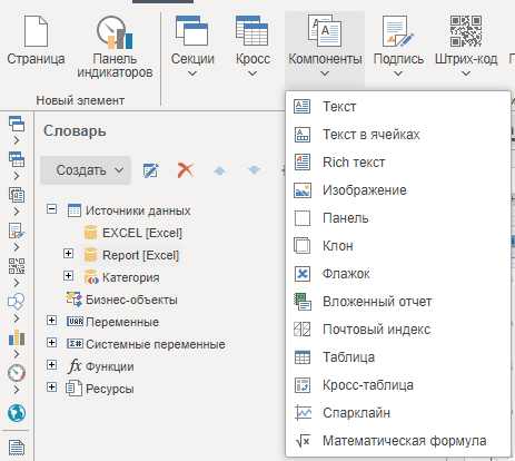 Компоненты К компонентам относятся: Текст, Кросс-таблица, Таблица и другие элементы. Компоненты могут добавляться как напрямую на страницу, так и в качестве элементов к Заголовкам и Итогам. Редактор компонента Математическая формула
