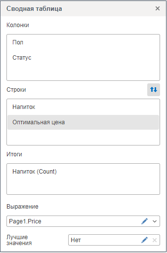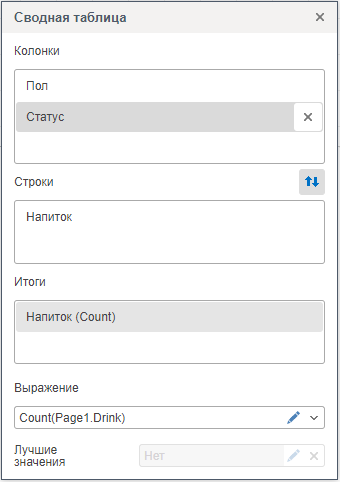 В Cводную таблицу необходимо добавить как минимум одно поле данных в графу Итоги. Настройки элемента Сводная таблица размещаются в редакторе элемента.