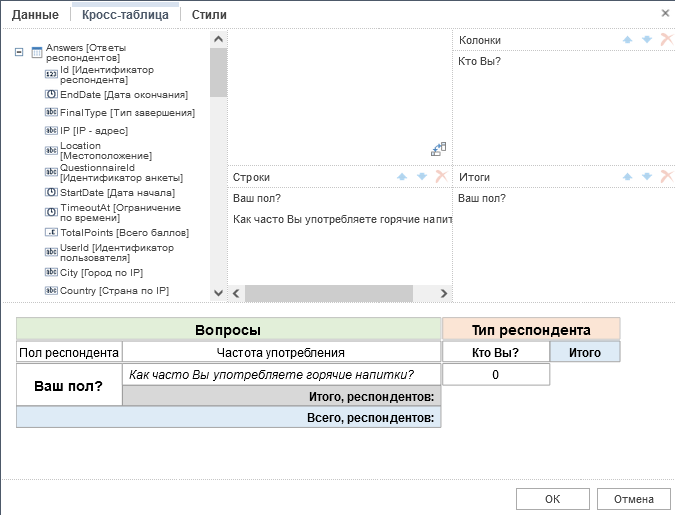 Колонка внизу - в ней отображается предварительная структура кросс-таблицы.
