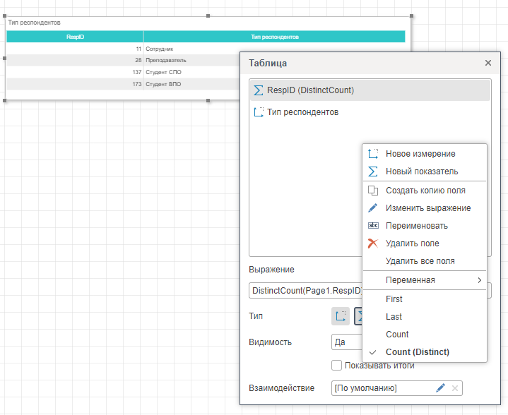 • Показатель Поля данных . По умолчанию, этот тип графы применяется для всех числовых типов данных. Также, он используется в случае, если необходимо группировать значения текущего графы данных по значениям другого графы данных.