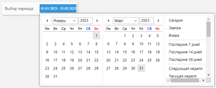 Элемент Выбор даты может быть только главным элементом фильтрации для других элементов фильтрации и не может зависеть от значений других элементов фильтрации. Элемент Выбор даты может работать в следующих режимах выбора: