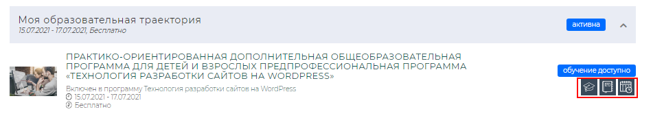 После того как обучающийся зачислен в группу и обучение уже началось появляются кнопки [Перейти к обучению], [Мой дневник] и [Расписание].