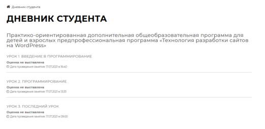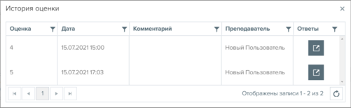 На данной странице обучающийся может просмотреть свои оценки за занятия, дату проведения занятия, дату получения оценки, а также просмотреть историю оценки и комментарии к ней.