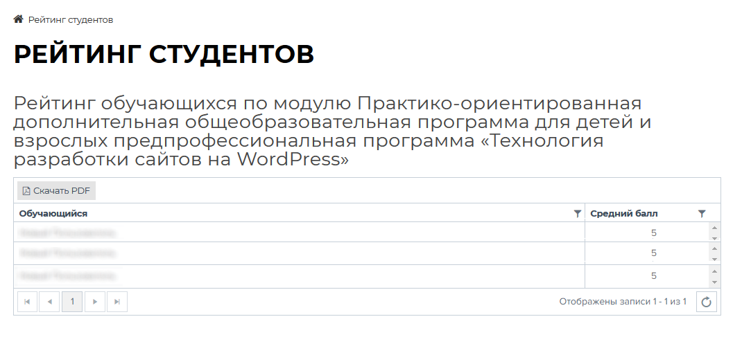 Рейтинг студентов можно скачать в формате PDF, нажав на кнопку