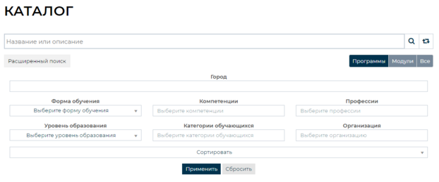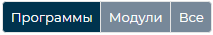 В каталоге предусмотрена фильтрация образовательных программ и модулей для отображения. Для того, чтобы просмотреть программы необходимо нажать на кнопку [Программы], для просмотра модулей кнопку [Модули], либо нажать кнопку [Все] для просмотра и модулей и программ.
