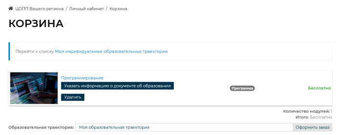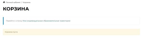 Чтобы просмотреть все свои заказы на обучение и информацию по ним, нужно перейти по ссылке в сообщении в самой корзине, либо на страницу «Индивидуальные образовательные траектории», выбрав в меню пользователя