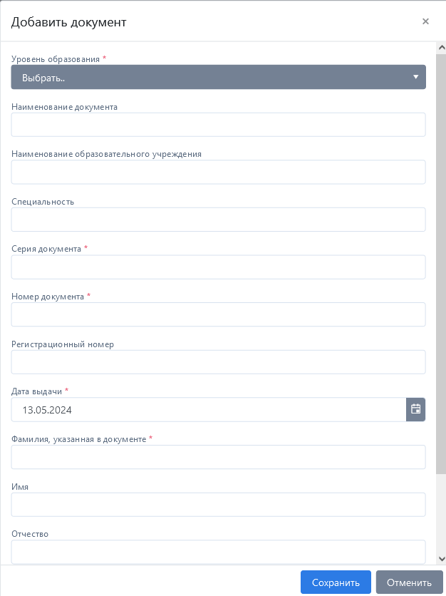 При оформлении заказа на обучение пользователь может указать информацию о документе об образовании. Для этого необходимо нажать на кнопку