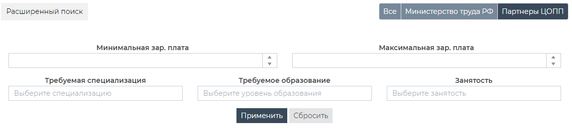 Можно указать минимальную и максимальную зар. плату, требуемую специализацию и образование, а также выбрать тип занятости.