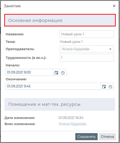Редактирование дополнительной информации по выбранному занятию