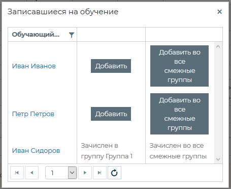 Во всплывающем окне со списком записавшихся на обучение нажать напротив имени студента кнопку [Добавить], либо [Добавить во все смежные группы], если студент записался на все модули процесса.