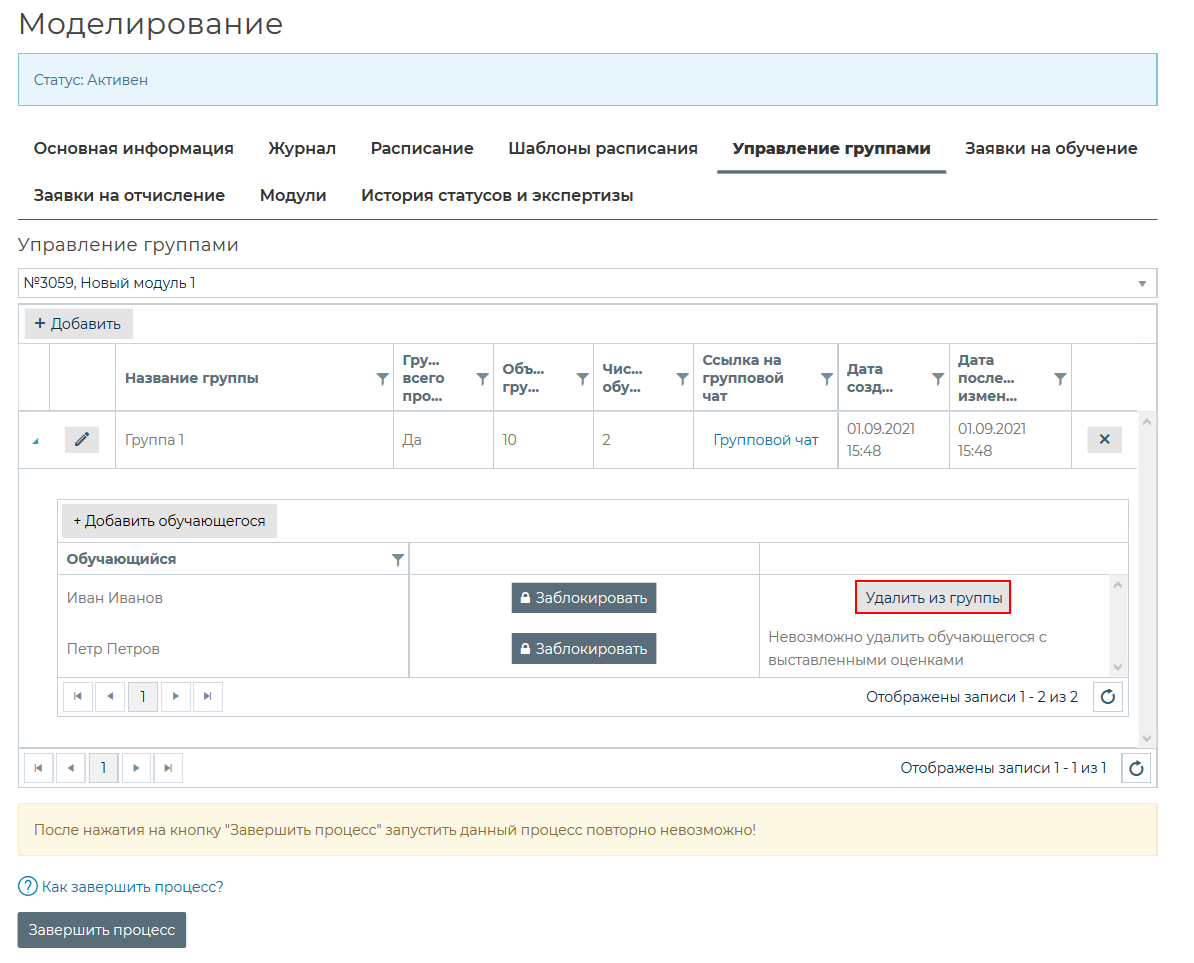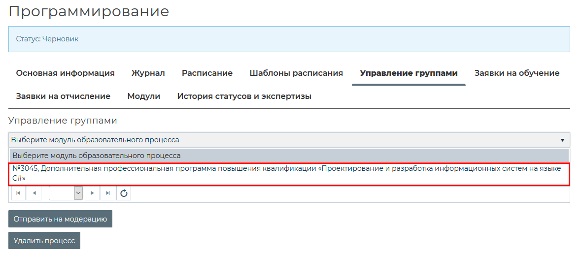 в поле с надписью «Выберите модуль образовательного процесса» и выбрать из выпадающего списка модуль, по которому будет проходить обучение группы.