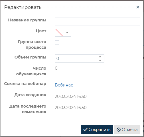 Окно редактирования информации группы