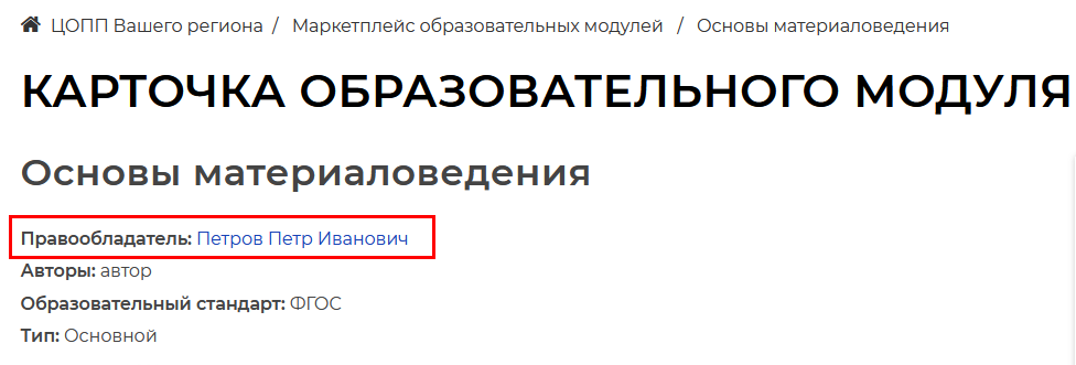 Карточка модуля из маркетплейса. Ссылка на публичную карточку организации-правообладателя модуля