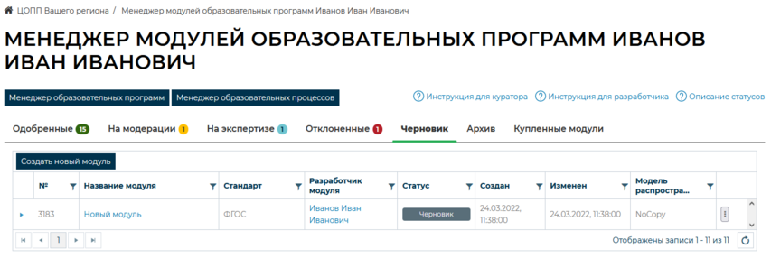 Менеджер модулей образовательных программ. Вкладка «Черновик»