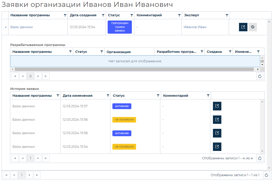 . Здесь отображается информация о разработанных программах по данной заявке, а также история заявки.