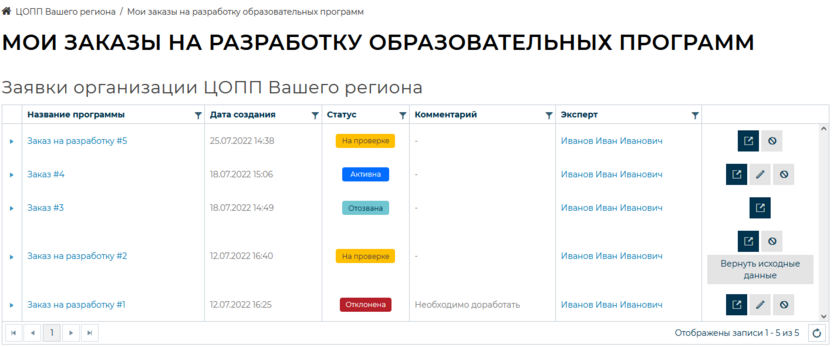 После одобрения заявки модератором, она появляется в общем списке заявок (на странице Список заявок на разработку образовательных программ)