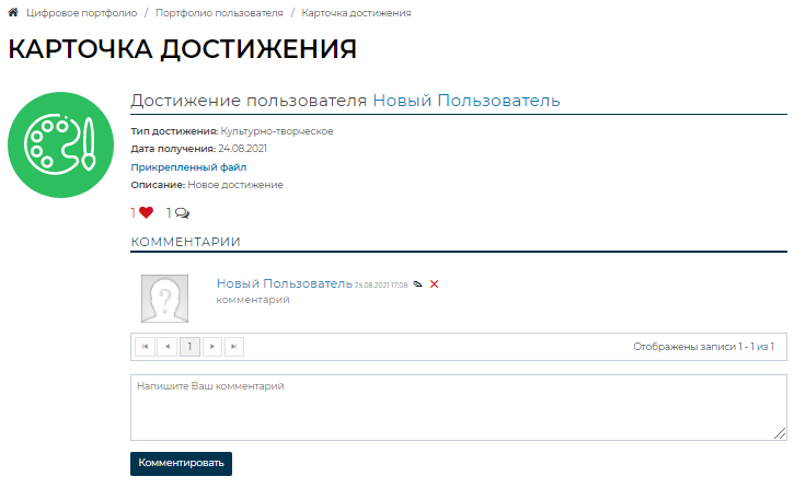 В новом окне открывается «Карточка достижения», в которой отображается основная информация достижения, прикрепленные файлы и изображения, оценки и комментарии.