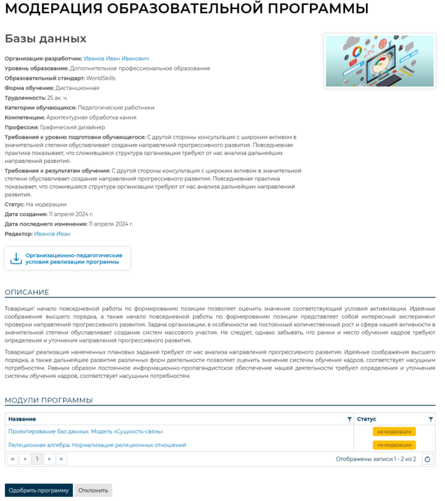 Для того, чтобы провести модерацию образовательной программы необходимо нажать на кнопку