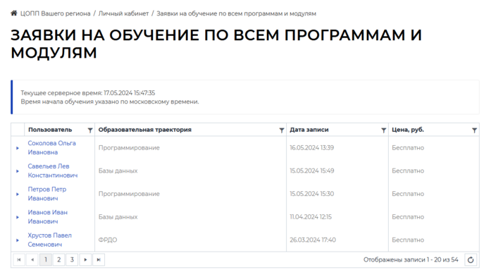В этом разделе сотрудник ЦОПП может просмотреть все запросы пользователей на образовательные модули и программы, а также данные их профиля.
