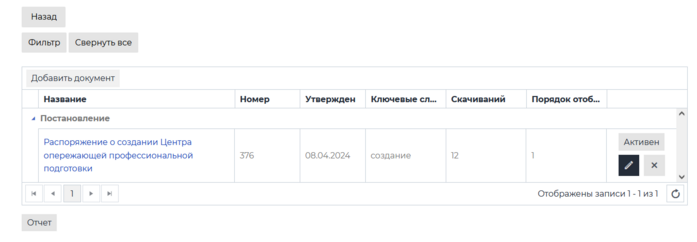 Статус документа «Активен» означает, что он доступен для просмотра пользователям платформы. Если документ «В архиве», то его может видеть только пользователи с ролями Администратор и Модератор.