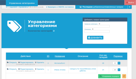 Перейдя в раздел Управление контентом (добавить/редактировать медиа) пользователю загрузится Управление категориями. Здесь размещена информация о последних изменениях, список категорий с управлением.