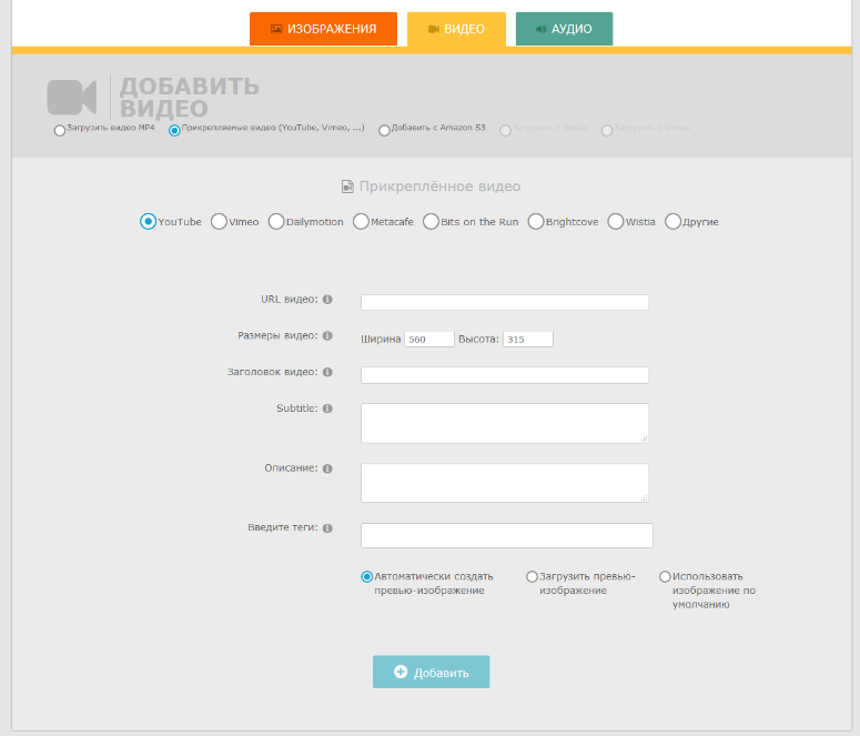 Для видео необходимо выбрать с какого ресурса добавляется видео и указать URL, заполнить прочие поля настроек, нажать кнопку «Добавить».