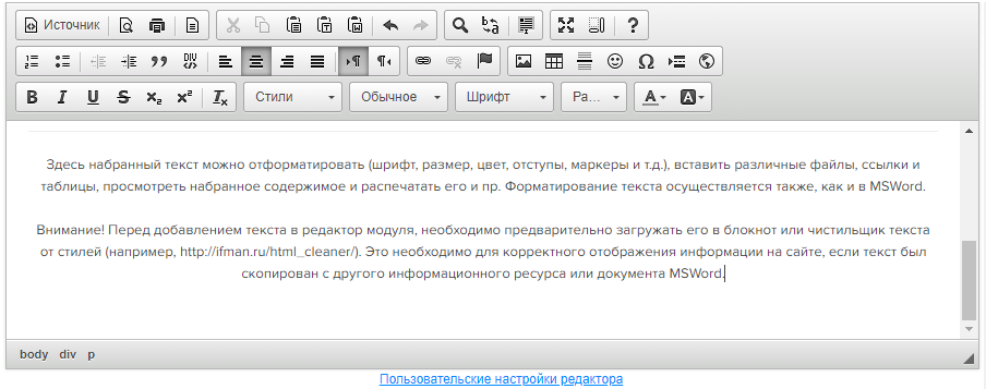 Перед добавлением текста в редактор модуля, необходимо предварительно загружать его в блокнот или чистильщик текста от стилей (например, http://ifman.ru/html_cleaner/). Это необходимо для корректного отображения информации на сайте, если текст был скопирован с другого информационного ресурса или документа Microsoft Word.