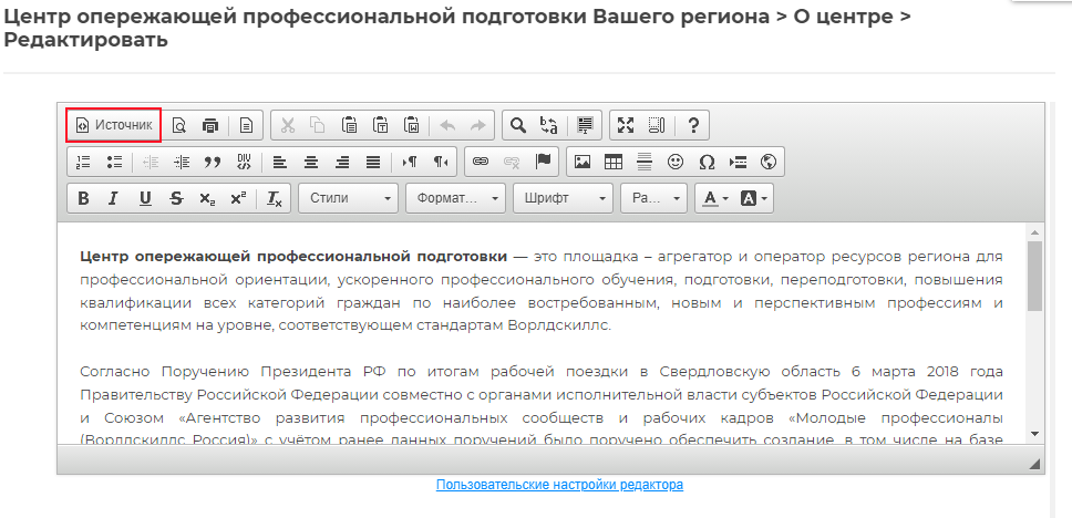 Если необходимо отредактировать текст в уже добавленном и сформированном фрагменте HTML-коде, то лучше всего не удалять информацию полностью, а перейти в Источник (HTML-редактор) и заменить необходимы текст.