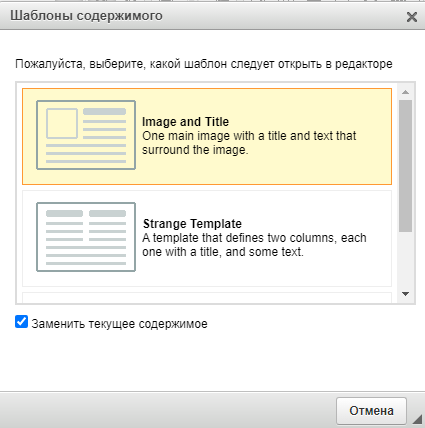 В появившемся окне выбрать нужный шаблон и нажать на него для вставки. По умолчанию стоит галочка «Заменить текущее содержимое», если её оставить ранее набранное содержимое заменится новым шаблонным текстом и разметкой.