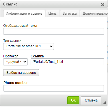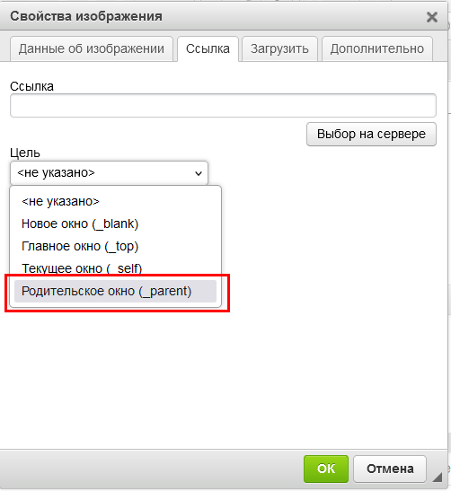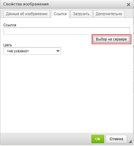На вкладке «Ссылка», после нажатия кнопки «Выбор на сервере», на сервере необходимо выбрать изображение и полученную ссылку вставить в поле «Ссылка» на вкладке «Данные об изображении». Также при необходимости на вкладке «Ссылка» выбрать «Цель», где будет загружаться изображение при его нажатии.
