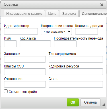 При необходимости можно указать дополнительные параметры ссылки на вкладке Дополнительно.