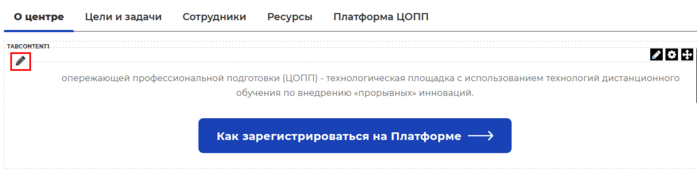 Для редактирования текста в редакторе на странице необходимо нажать иконку редактирования (карандаш) в левом верхнем углу.