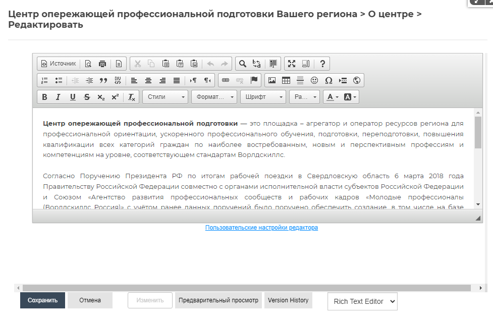 В расширенном редакторе контент можно изменять и форматировать (шрифт, размер, цвет, отступы, маркеры и т.д.), добавлять различные файлы, ссылки и таблицы, просматривать набранное содержимое и распечатать его и пр. Форматирование текста осуществляется также, как и в Microsoft Word.