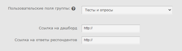 Для отображения ссылки на дашборд и ответы респондентов опроса для пользователя с ролью Координатор необходимо заполнить пользовательские поля. В поле «Пользовательские поля группы:» выберите значение «Тесты и опросы». В поле «Ссылка на дашборд» укажите ссылку на дашборд опроса, в поле «Ссылка на ответы респондентов» укажите ссылку на ответы респондентов.