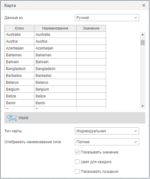 Поля таблицы: Ключ, Наименование, Значение, Цвет (появляется четвертым столбцом, только при включенном параметре Цвет для каждого). Если выбран тип карты Группа или Тепловая карта с группировкой, будет отображаться колонка для ключей группировки элементов карты. По умолчанию, ключи и элементы карты заполнены, но необходимо ввести значение для определенного элемента карты, и указать ключ группировки (если нужно).