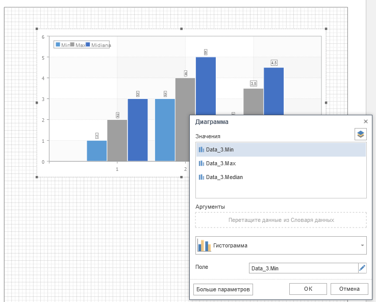 Для того чтобы добавить диаграмму на Страницу, необходим как минимум одно поле данных указанное в поле Значения.