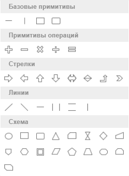 Примитивы Геометрические примитивы предоставляют возможность визуального оформления отчетов. К примитивам относятся: Базовые примитивы; Примитивы операций; Стрелки; Линии; Схемы.
