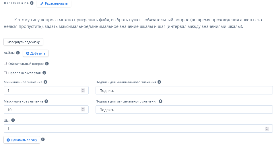 К этому типу вопроса можно прикрепить файл, выбрать пункт – обязательный вопрос (во время прохождения анкеты его нельзя пропустить), задать максимальное/минимальное значение шкалы и шаг (интервал между значениями шкалы).