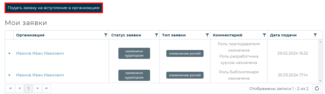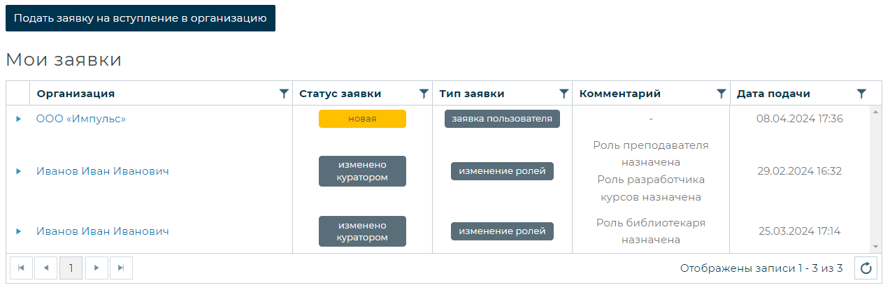 Мои заявки на вступление в организацию