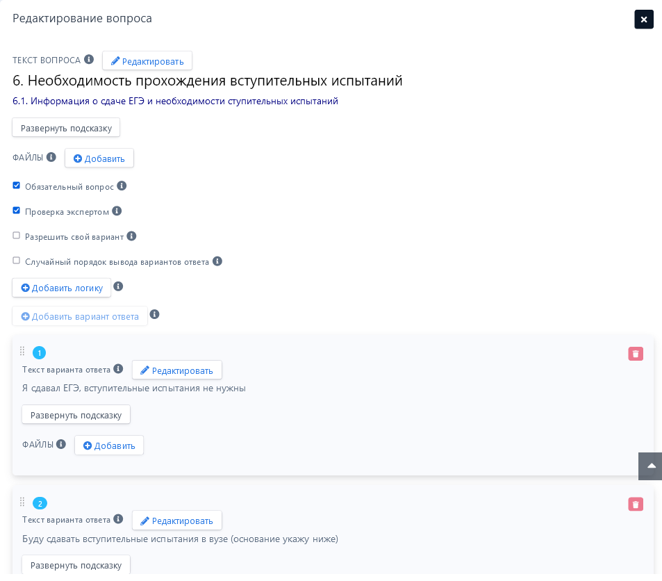 К этому типу вопроса можно прикрепить файл, выбрать пункт – обязательный вопрос (во время прохождения анкеты его нельзя пропустить), разрешить добавлять свой вариант ответа (отвечая на вопрос, пользователь сможет предложить свой вариант ответа), добавлять случайный порядок вывода вариантов ответа (варианты ответа будут представлены случайным образом), задавать максимальное и минимальное количество отмечаемых вариантов ответа.