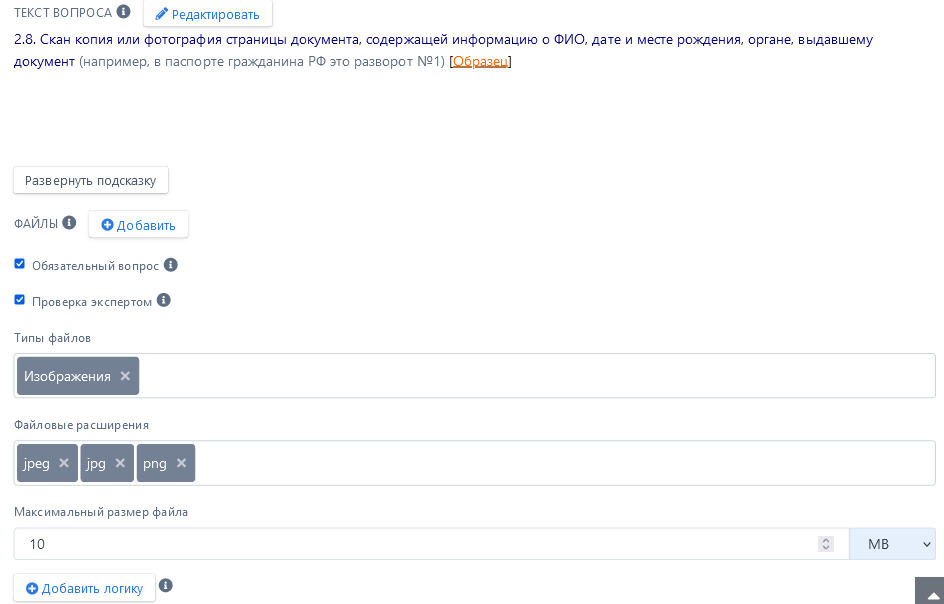 Отображение конструктора анкеты. Тип вопроса – Загрузка файла