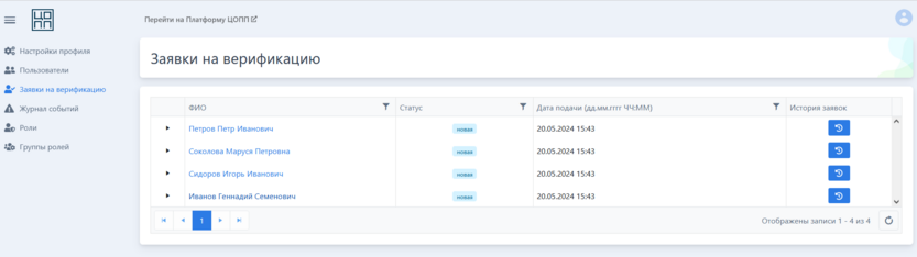 Раздел доступен из меню личного кабинета Администратора во вкладке «Заявки на верификацию пользователей».