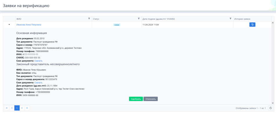 , отобразится вся основная информация о пользователе, а также о законном представителе, в случае, если пользователь несовершеннолетний (меньше 18 лет).